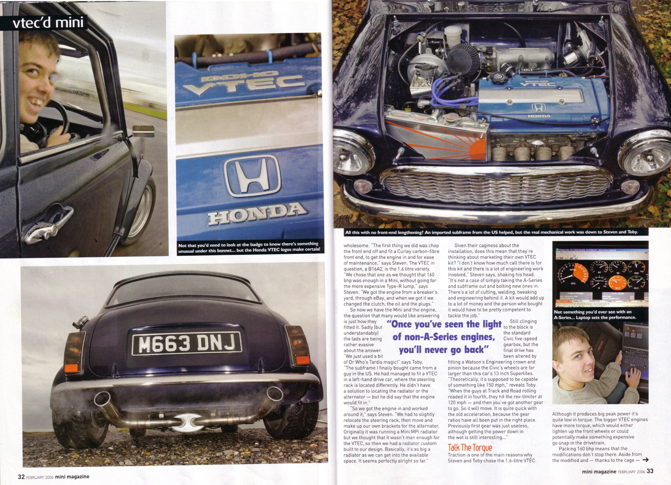 Steves VTEC-Mini made the cover of Mini Magazine in the UK - Feb 2006 issue. If you didn't manage to get yourself a copy of the magazine for the article, fear not, as we have it here! Enjoy...